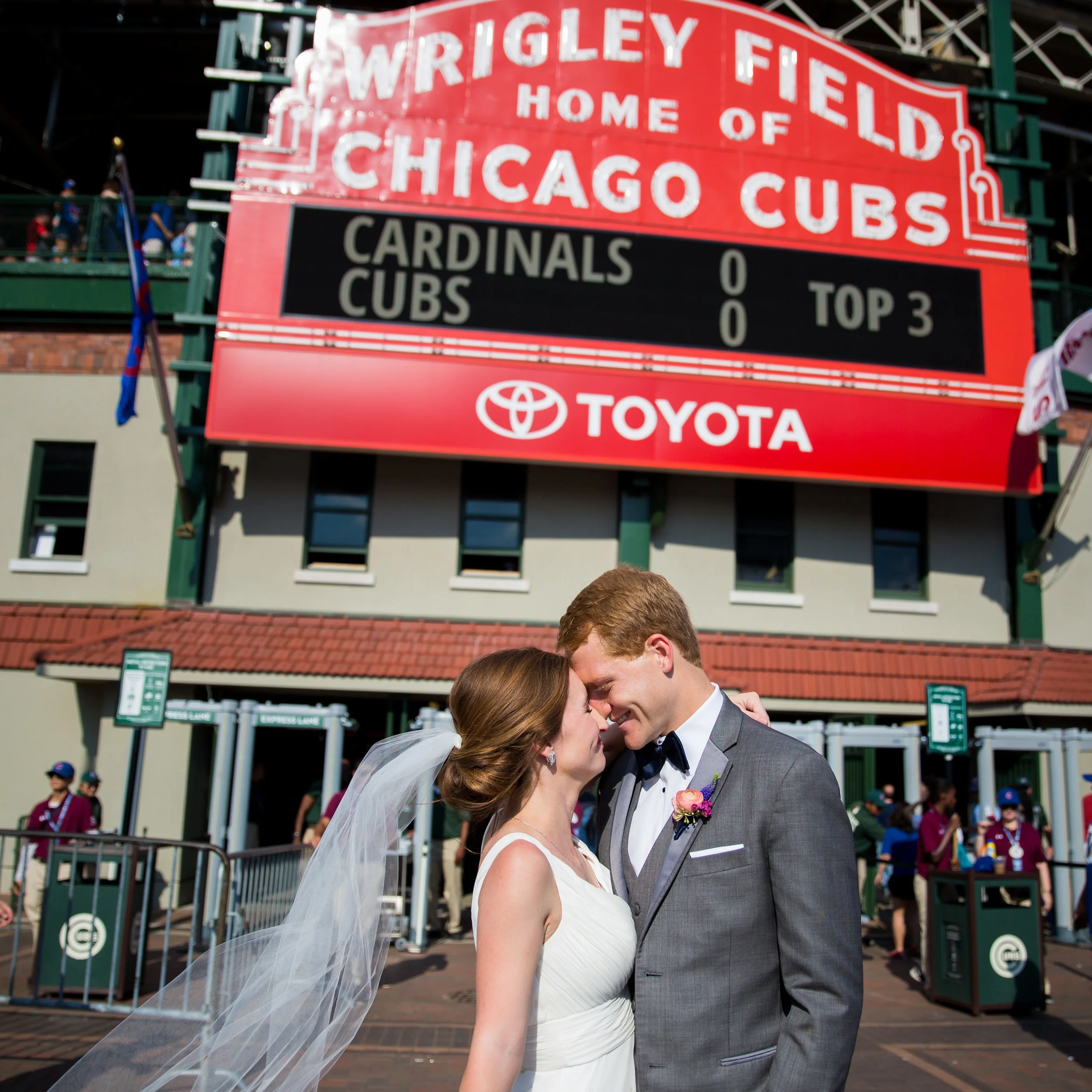 When we were planning out the timeline of their day, Holly told me that there were a few requests she and Mark had for how they would like to spend their time. One was that they get a photo at Wrigley Field, one was that we have a fun relaxing time with their wedding party and families on the trolly, and one was that we stop by their favorite bar for a drink before the reception. As you know, here at Erin Evangeline Photography we always aim to please, so... It was game day at Wrigley (which the Cubs won 4-1 six innings later!), they had the most awesome atmosphere on a wedding trolly I have ever seen, and their favorite bar had decorated the back room specifically for them when we stopped by. It was a successful wedding day all around!! WISHES GRANTED!!